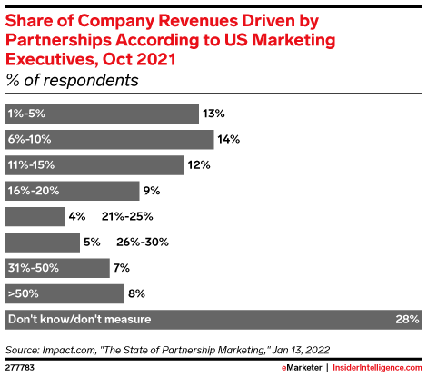 KEY STAT: More than a quarter (28%) of US marketing executives said they do not know or do not measure partnership marketing’s effect on company revenues, despite it being a channel dominated by performance metrics.
