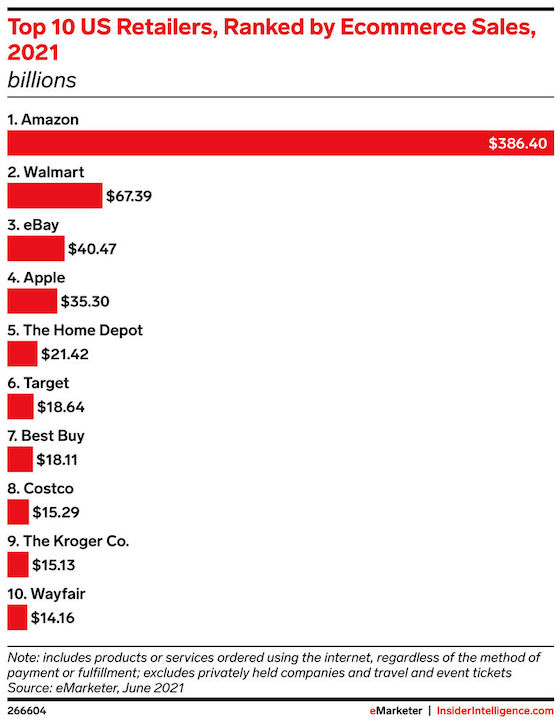 In 2021, Amazon will make more than $386 billion in US ecommerce sales, according our latest estimates. That’s about $320 billion more than its biggest ecommerce rival in the country, Walmart. In fact, if you combine the US ecommerce sales of the next nine top ecommerce retailers, the total will still be less than Amazon’s this year.