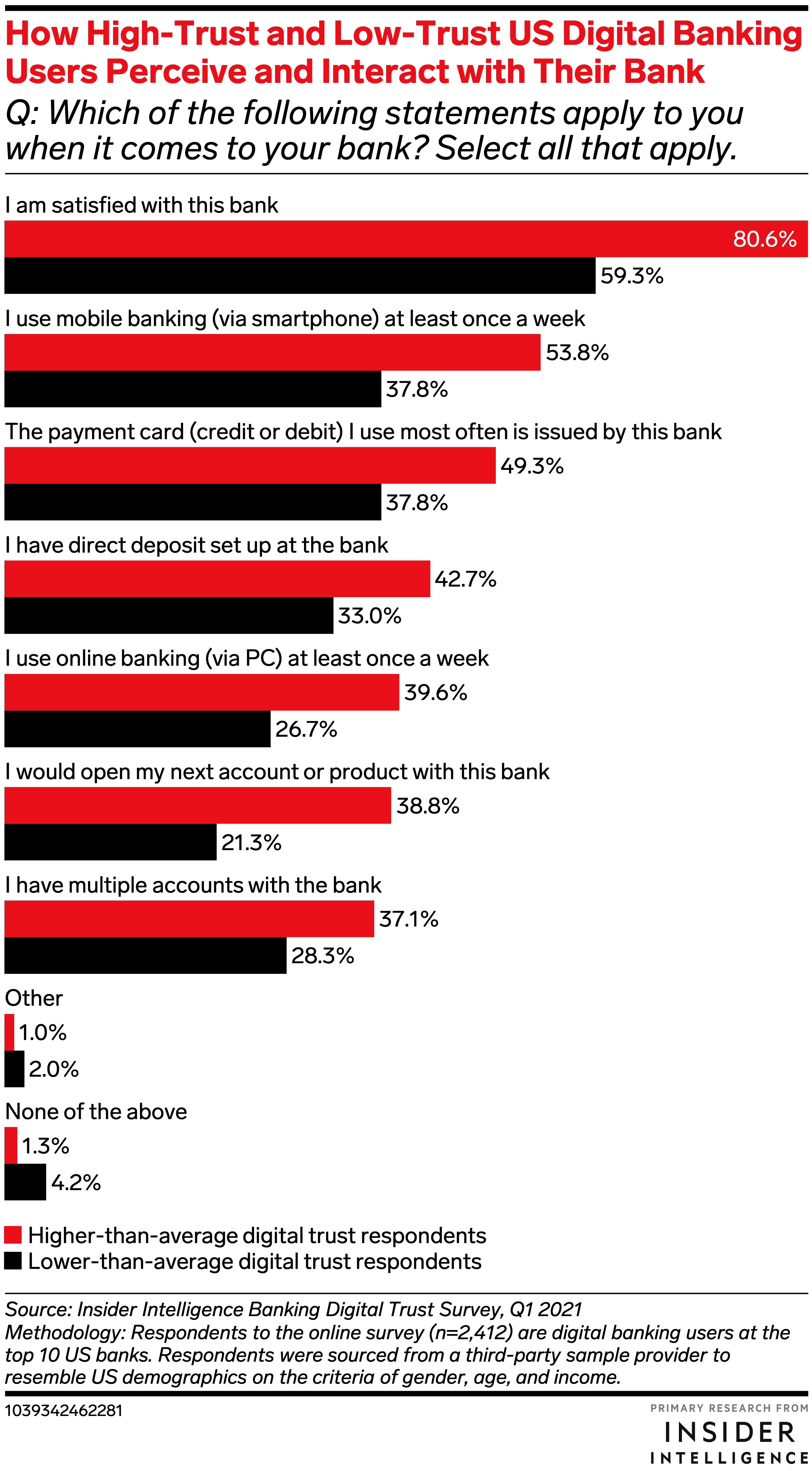 KEY STAT: Trust is essential to building brand loyalty: 38.8% of respondents with higher-than-average levels of digital trust said they would open their next account with their current bank, versus just 21.3% of respondents with lower-than-average trust levels.