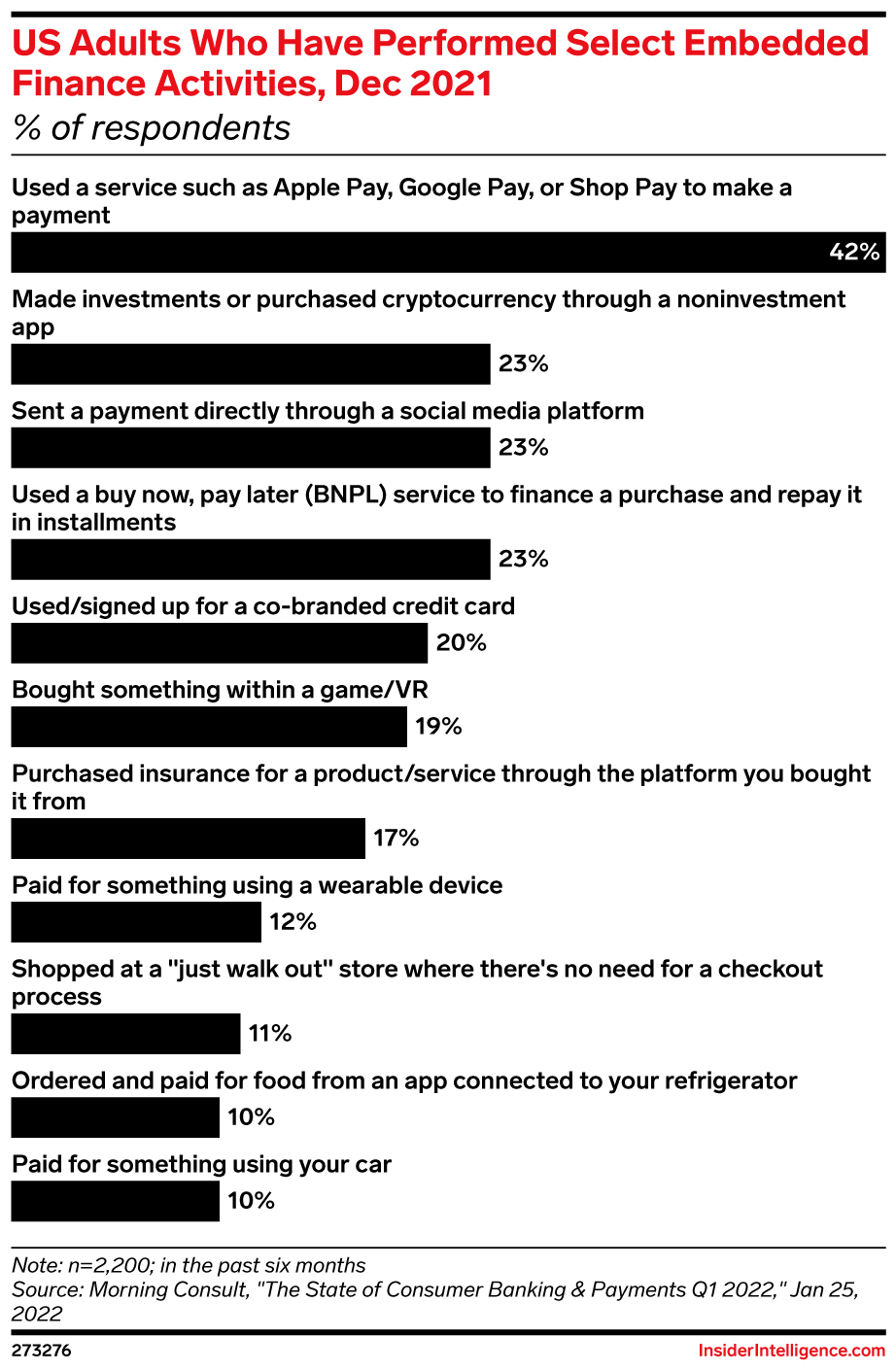 Data drilldown: The transaction value of embedded finance is projected to surge from $2.6 trillion to $7 trillion in the US by 2026, making up 10% of all US financial transactions, according to the report.