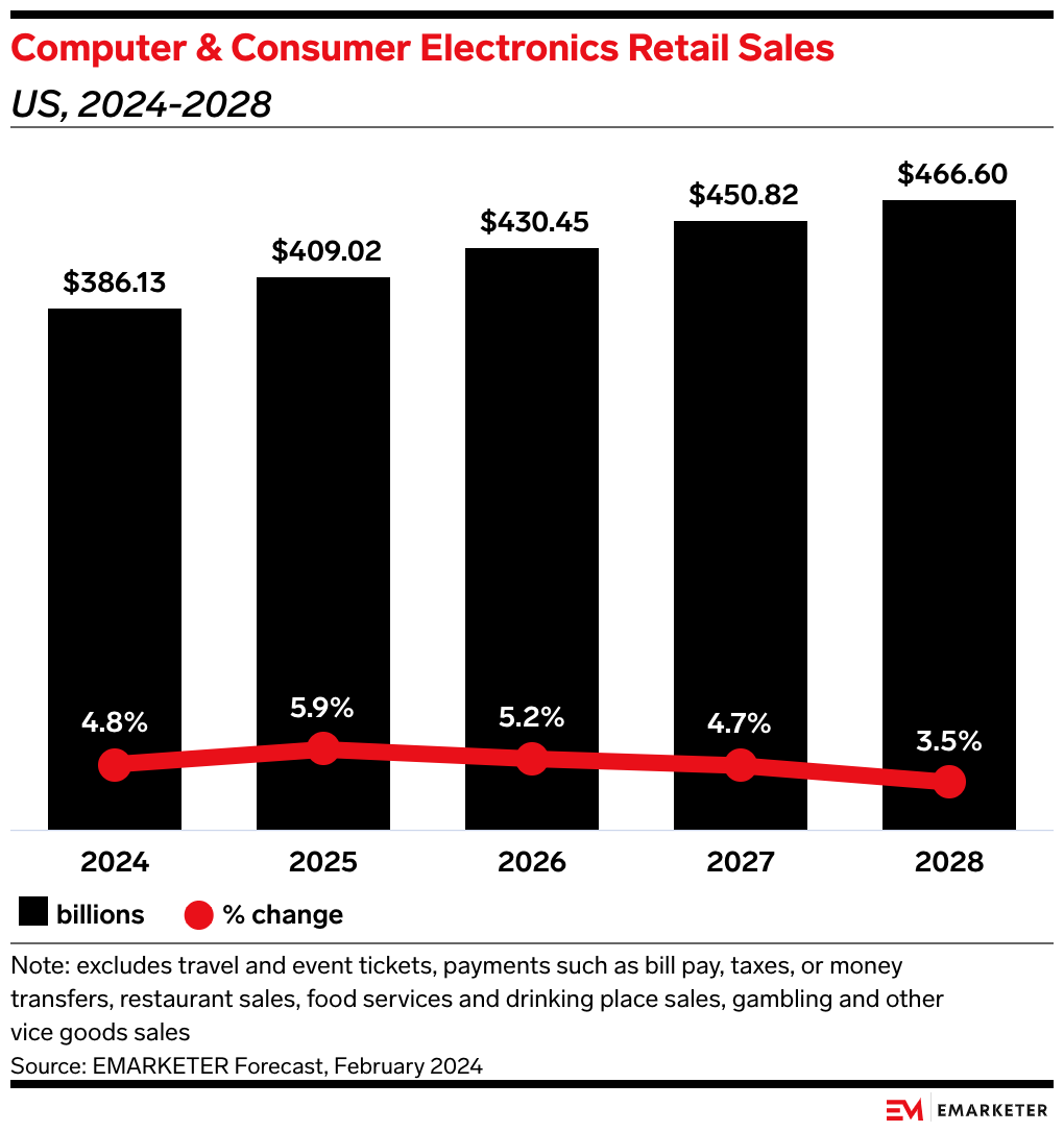- However, we expect computer and electronics sales to accelerate throughout the second half of the year. Our forecast expects sales in the category to grow 4.8% YoY, a significant gain after sales fell 2.0% YoY in 2022 and rose just 1.4% YoY last year.