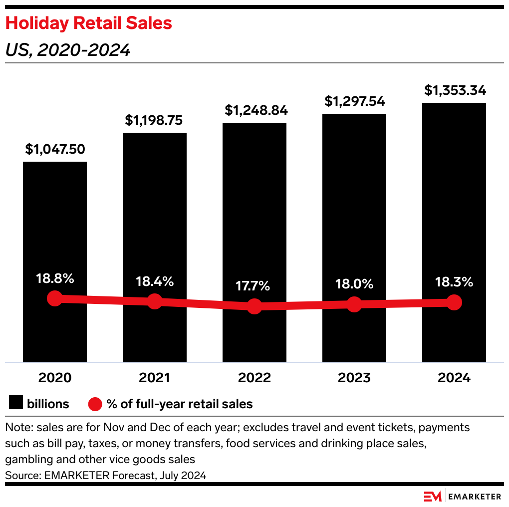 The bigger picture: A strong holiday season is crucial for payment providers’ overall growth given its share of the retail pie. Holiday retail sales are expected to make up 18.3% of full-year retail sales this year, per our forecasts.