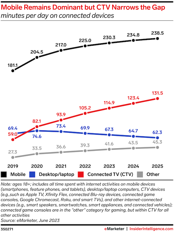 Key stat: US adults will spend an average of 230.3 minutes per day on mobile in 2023, according to our forecast. While they will spend less time with connected TV (CTV), at 114.9 minutes per day, the gap between CTV and mobile is shrinking.