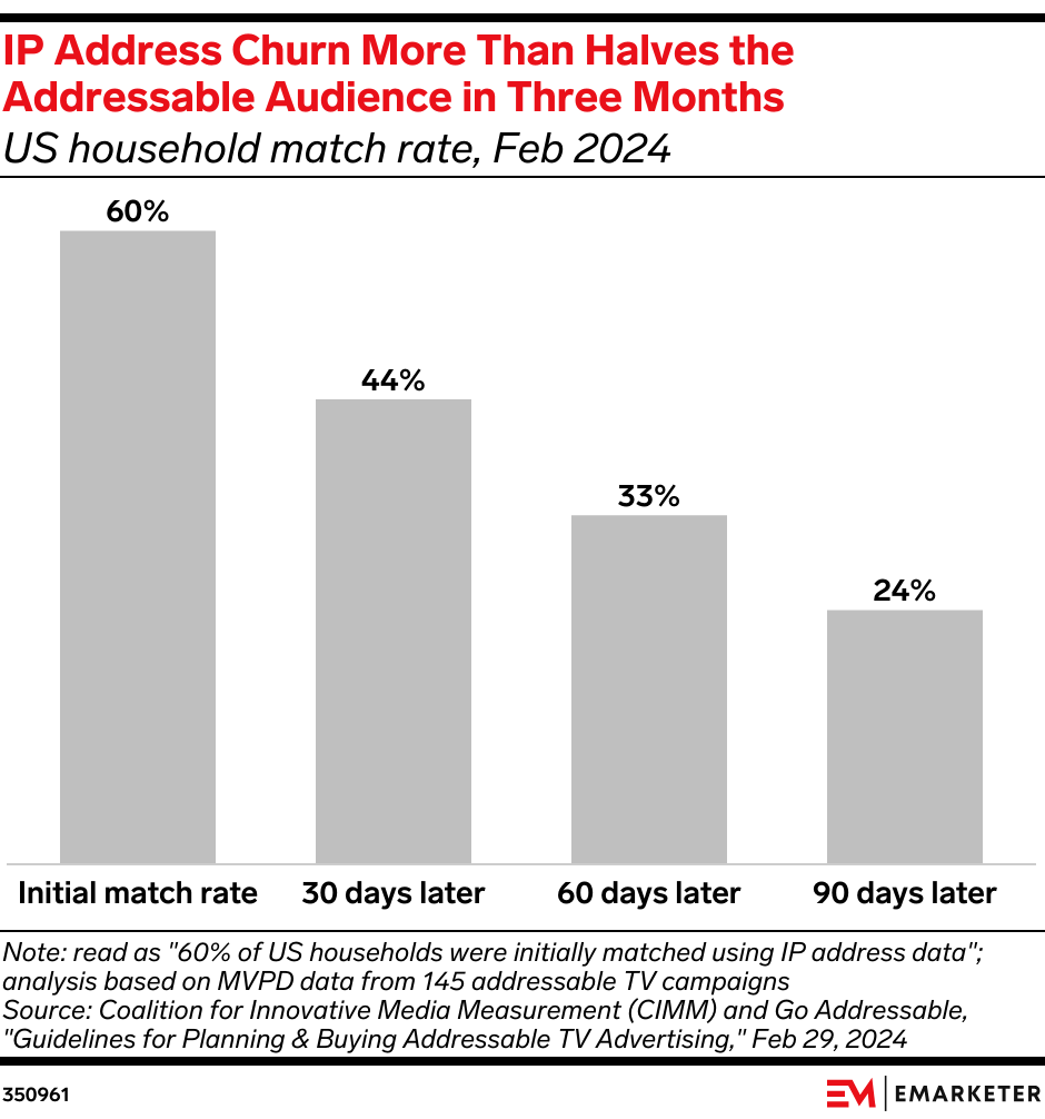 - IP addresses aren’t persistent identifiers. IP addresses are to CTV what cookies are to web browsers. The jury’s still out on whether they’ll remain available for advertising use cases in the long term, but even now, the fidelity of IP addresses is lower than might be expected. Only 3 in 5 US households were initially matched via IP address in an analysis conducted by the Coalition for Innovative Media Measurement (CIMM) and Go Addressable. And match rates eroded with time, dwindling to fewer than 1 in 4 within 90 days, which can throw a major wrench in post-campaign reporting.