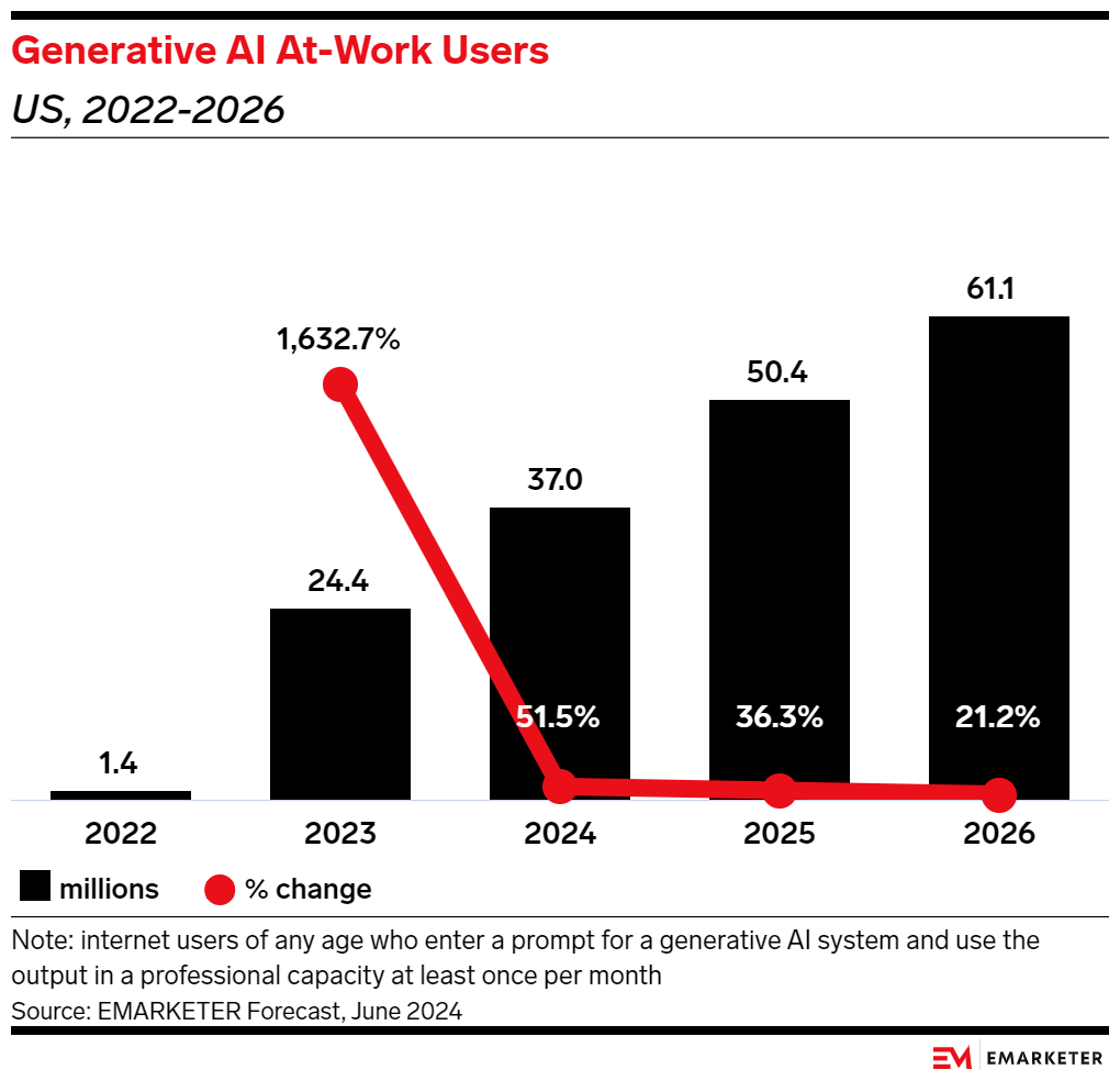 Zooming out: The pool of genAI users is still growing, albeit at a slower rate than during the tech’s big boom in late 2022 and 2023. While we expect 2024 to end with 51.5% YoY growth in at-work genAI users, we forecast that growth to drop to 21.2% by 2026.