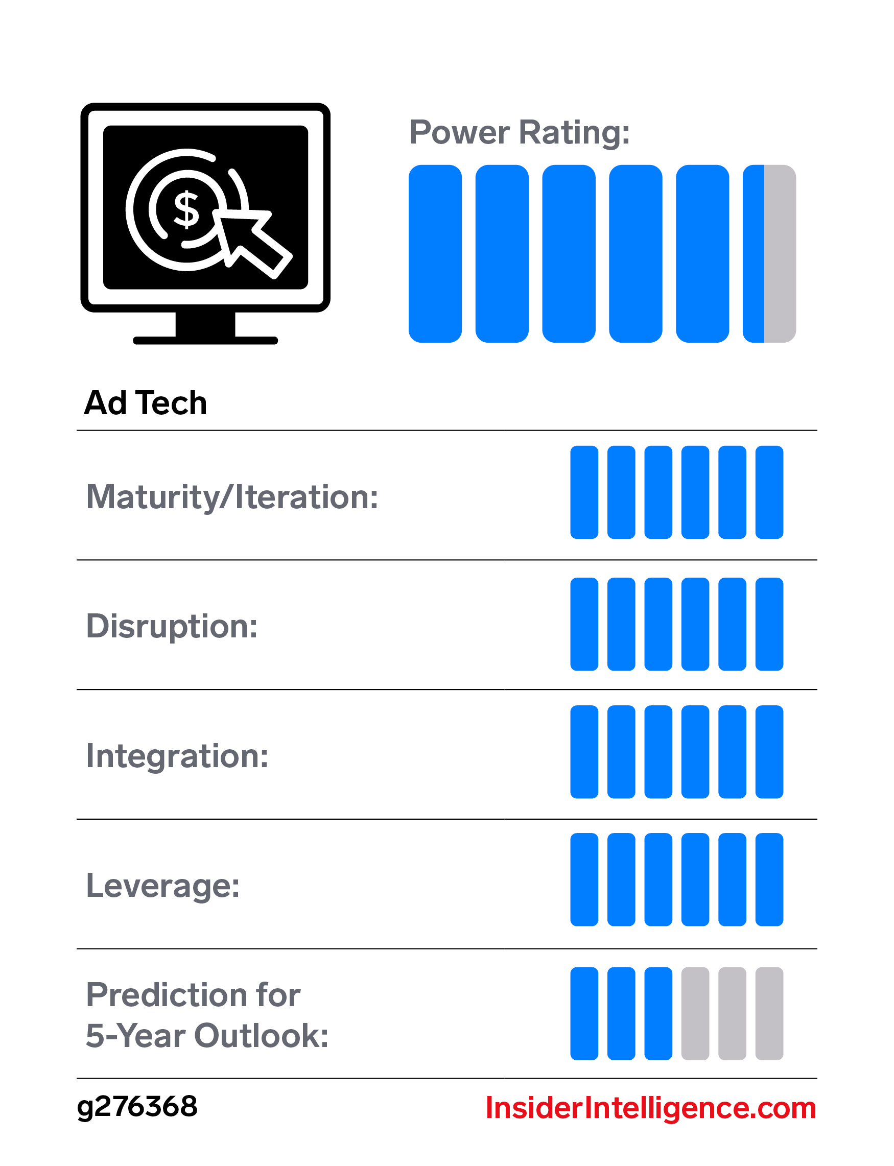 Note: Our analysts assessed 23 of Alphabet’s business divisions based on five factors: maturity/iteration; disruption; integration; leverage; and prediction for a 5-year outlook. The scale used for the 5-year outlook power rating is: 1=Out of business; 3=Leader; 6=Massive growth. The 5 year outlook takes into account all aspects of the business analyzed, as well as our analysts’ knowledge of the competitive landscape for each division.