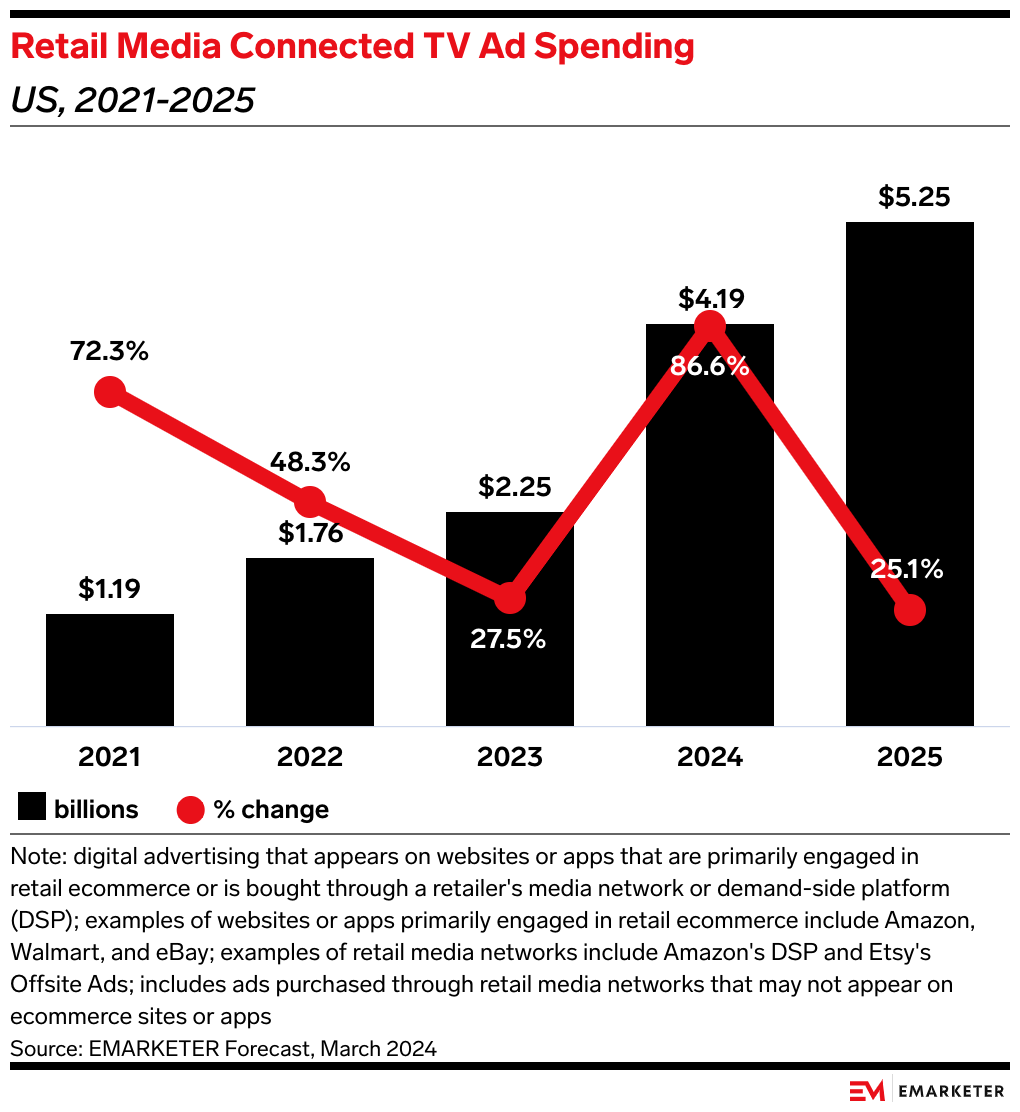 As the retail media channel evolves, advertisers have begun to explore off-site channels like connected TV (CTV), which will garner $4.19 billion in retail media ad spend in 2024, up 86.6% YoY, per a March 2024 EMARKETER forecast.