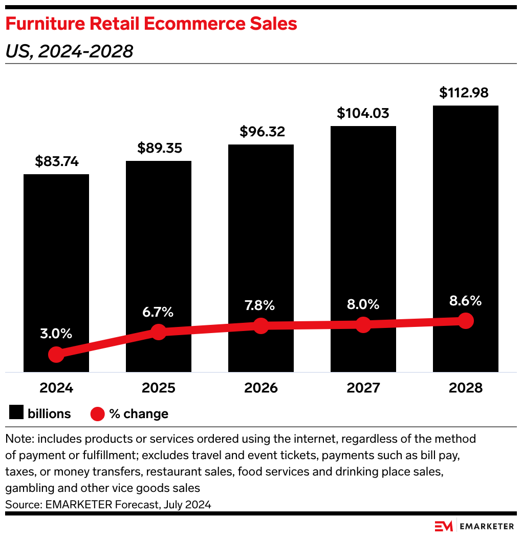 - We expect 32.8% of US furniture sales to occur online this year, up from 22.3% in pre-pandemic 2019. We expect that shift to continue with ecommerce penetration reaching 39.6% in 2028.