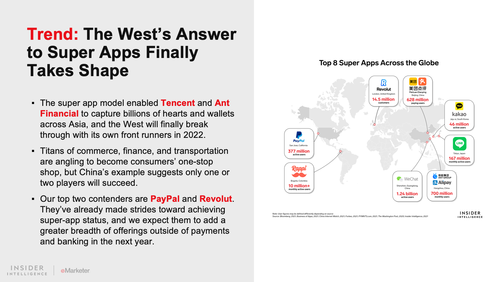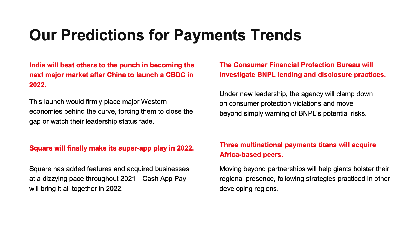 Payments are set to break physical and digital borders in 2022, connecting the world in more ways than ever. Innovations will lower barriers for payments across countries and continents, and the rise of super apps will bring all of consumers’ financial needs—including payments—into a single place. Meanwhile, innovations in lending will extend credit to once-inaccessible segments.