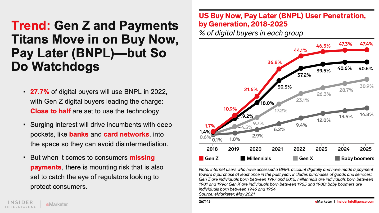 KEY STAT: Some 44.1% of US Gen Zers are expected to use BNPL in 2022, a higher share than those of all other generations.