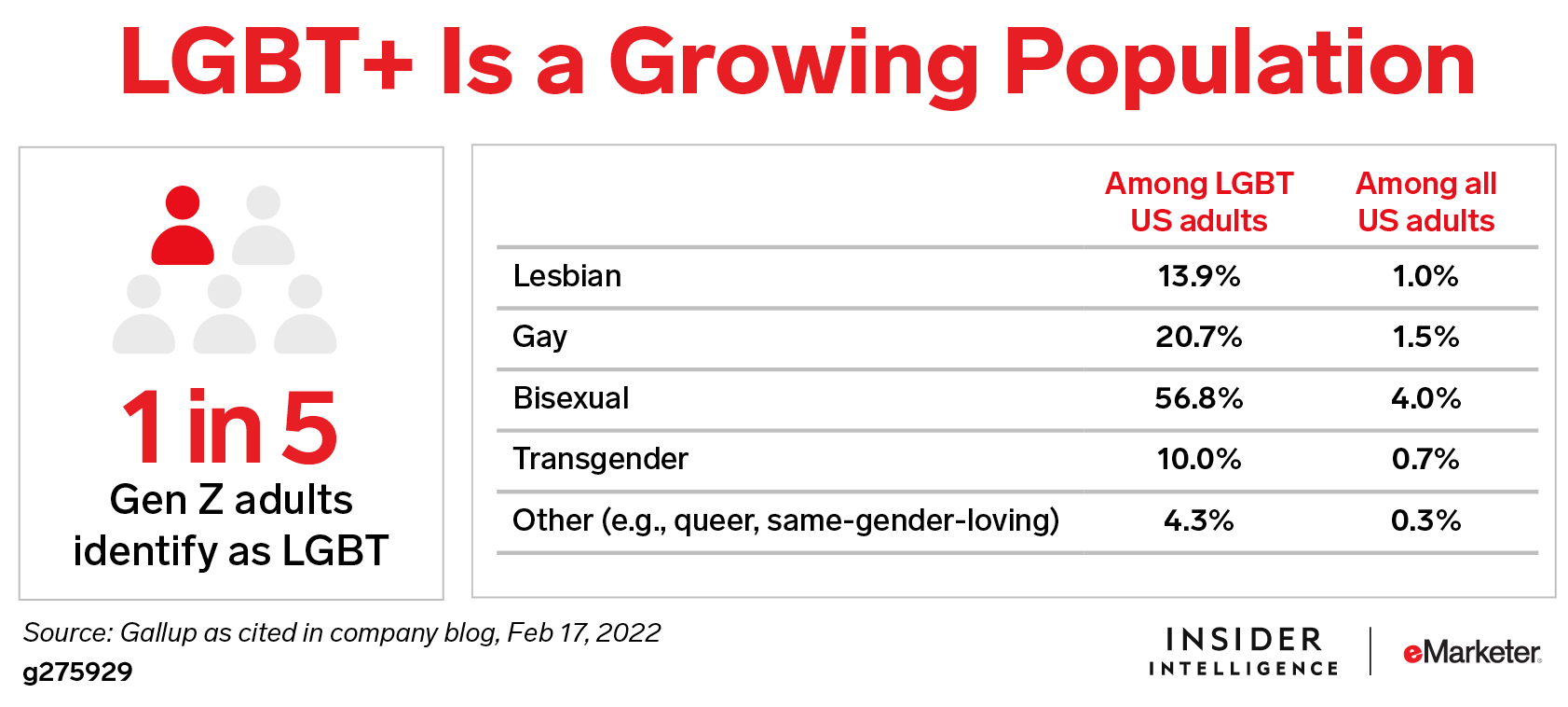 The trend: The number of lesbian, gay, bisexual, or transgender (LGBT+) people in the US continues to grow, with one of five adults in Generation Z identifying as members of this group, per Gallup.