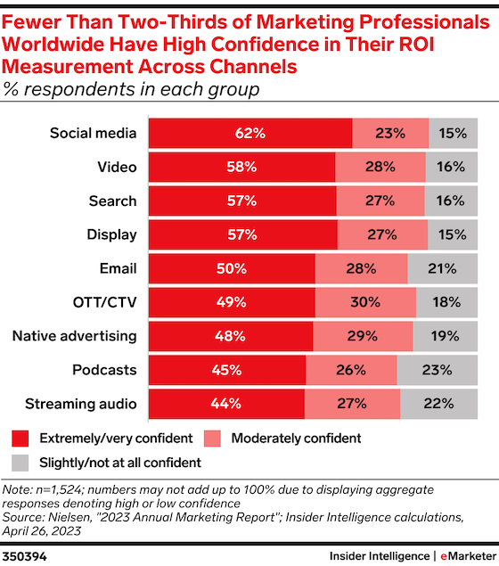 Key stat: More than half of advertisers worldwide are extremely or very confident in their ability to measure social media, video, search, and display marketing ROI, according to Nielsen.