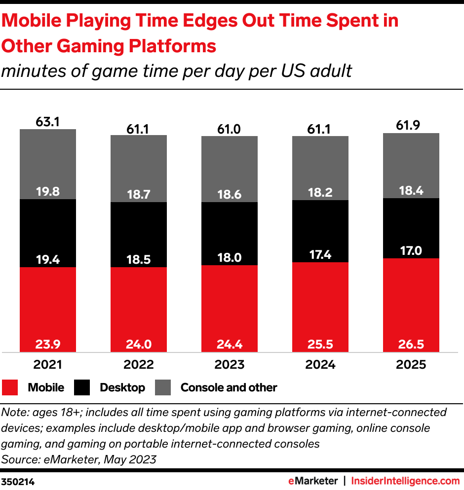 - Mobile games dominate in total users, but less so in time spent. In the US, there are nearly two smartphone game players for every PC, tablet, or console player. The difference in time spent is much narrower, though. We estimate that the average US adult plays mobile games 24.4 minutes per day, or 40.2% of their total time spent on video games.