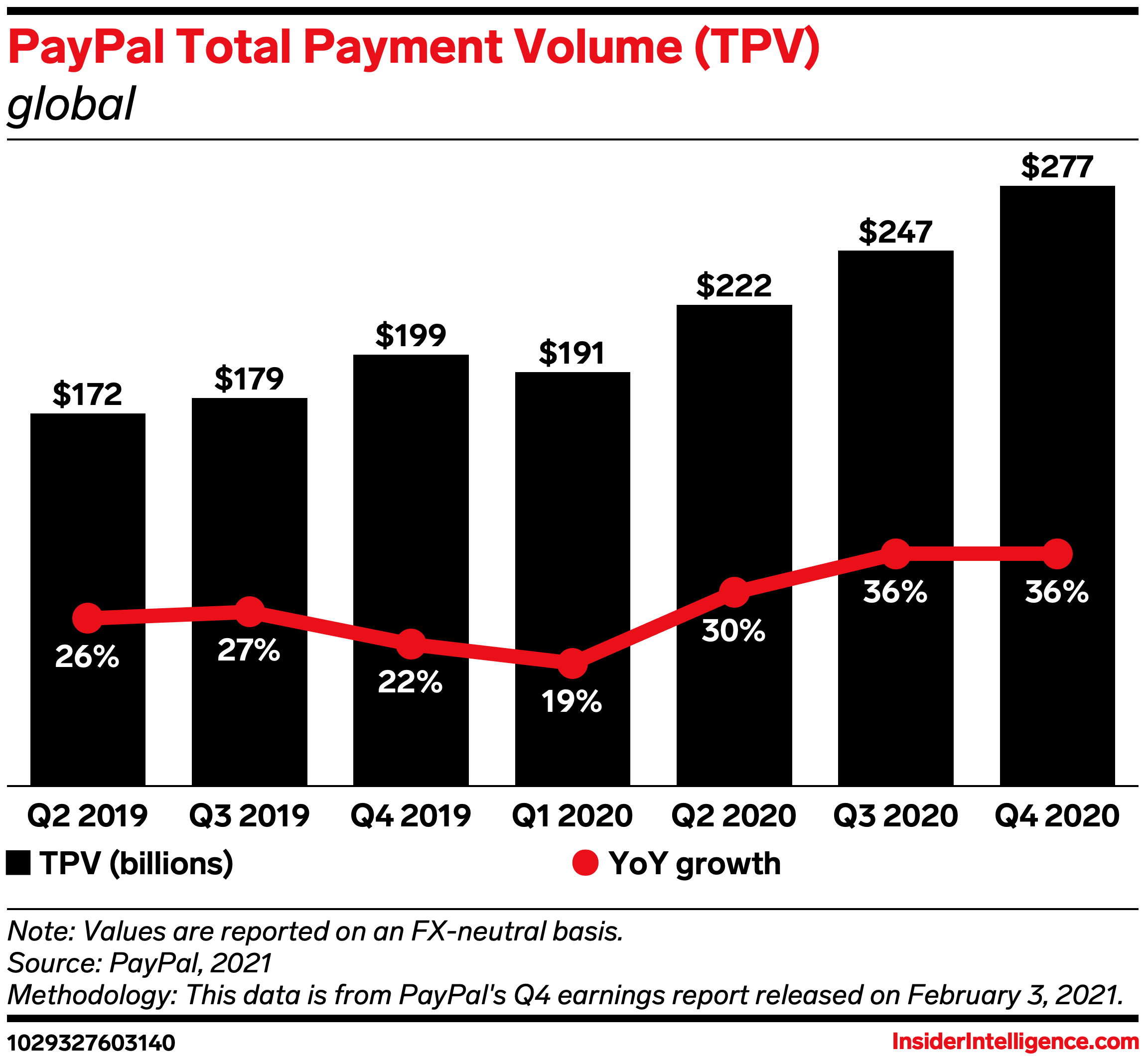 - PayPal processed $936 billion in total payment volume (TPV) in 2020 and says it's on track to reach $1 trillion a year. Digital payment usage surged during the pandemic, with 43% of US consumers saying they used mobile apps like PayPal and Venmo more in 2020, according to a report by CouponFollow. To meet that demand, PayPal launched new products like Pay in 4—its buy now, pay later solution—and its cryptocurrency service. PayPal also expanded Xoom, its remittance business, into more countries to make it more widely available. These efforts may have bolstered TPV by tapping into new demand.