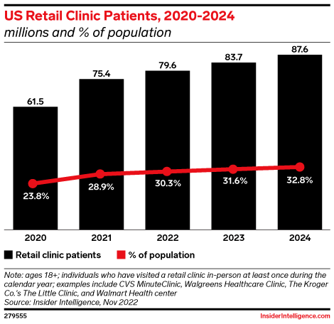 KEY STAT: We estimate that 83.7 million US adults, or 31.6% of the population, will visit a retail health clinic in-person this year.