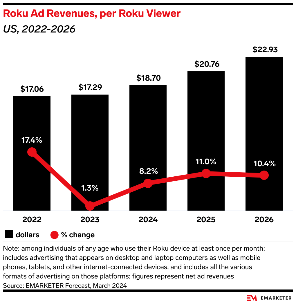 - Roku sells smart TVs and operates an ad-supported channel but faces more competition as rival streamers like Amazon and Netflix have added ad tiers.