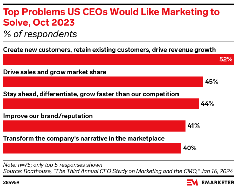 Key Stat: At least 40% of US CEOs expect CMOs to focus on five key growth challenges: revenue, market share, competition, reputation, and company narrative.