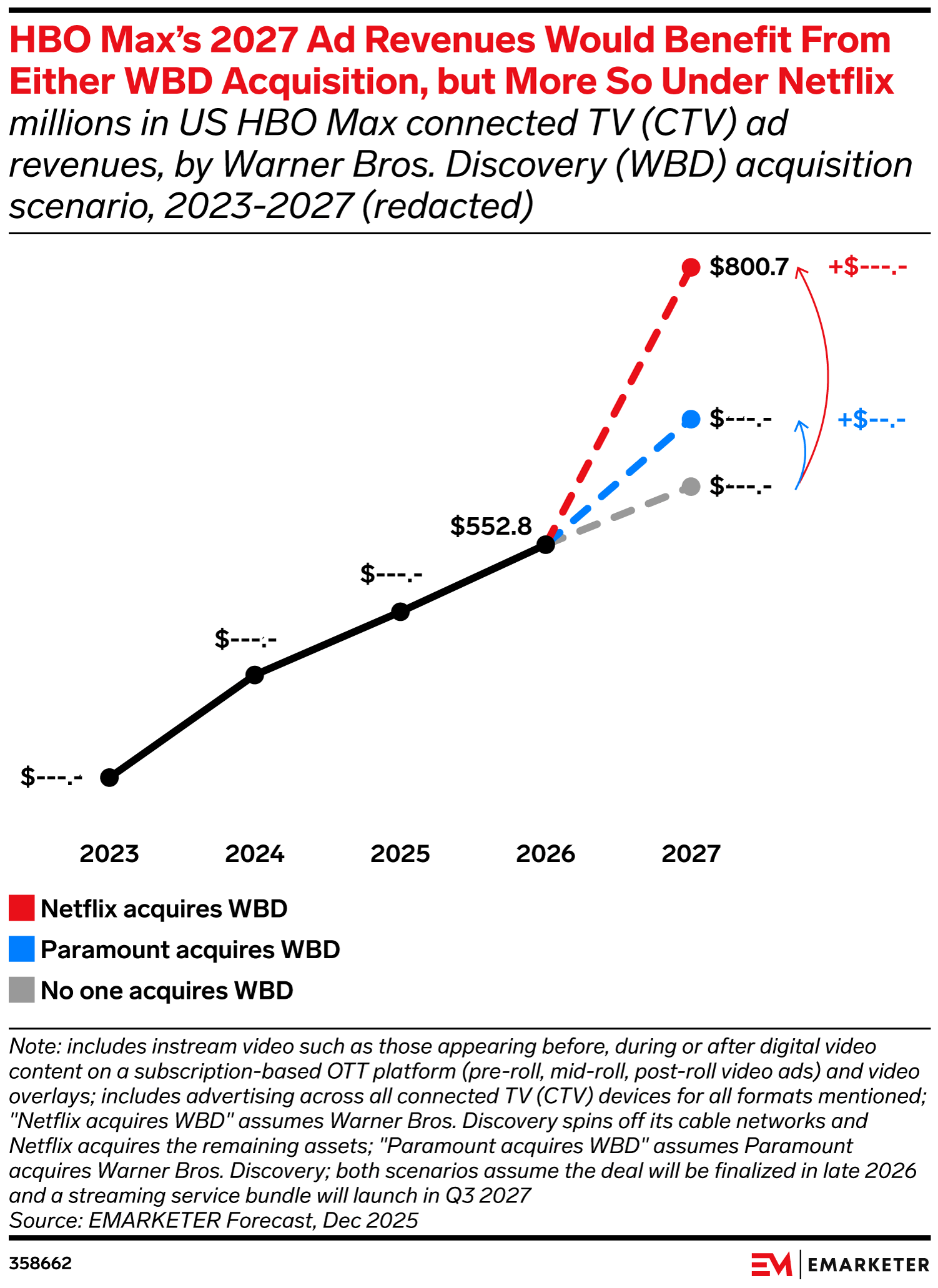 Key Stat: If HBO Max is acquired by Netflix, its 2027 ad revenues will be much higher than under any other scenario, leaping from just over $550 million in 2026 to more than $800 million next year.