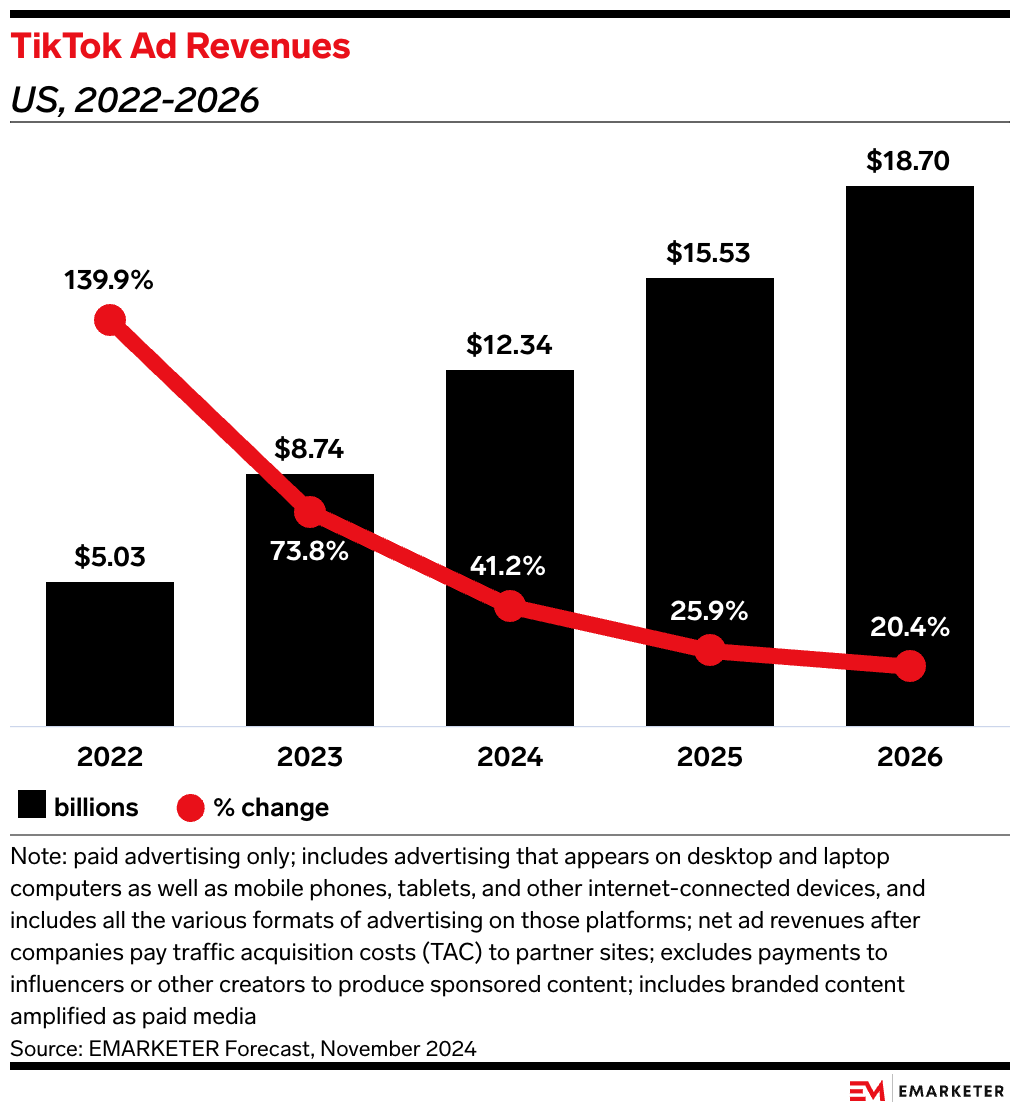Our take: Beyond the app’s large user base, which gives companies a big opportunity to increase their reach and revenues, TikTok also generates significant ad opportunities, with an expected $15.53 billion in ad revenues in the US in 2025, per our forecasts—and the Oxford report emphasizes the value that TikTok offers brands.