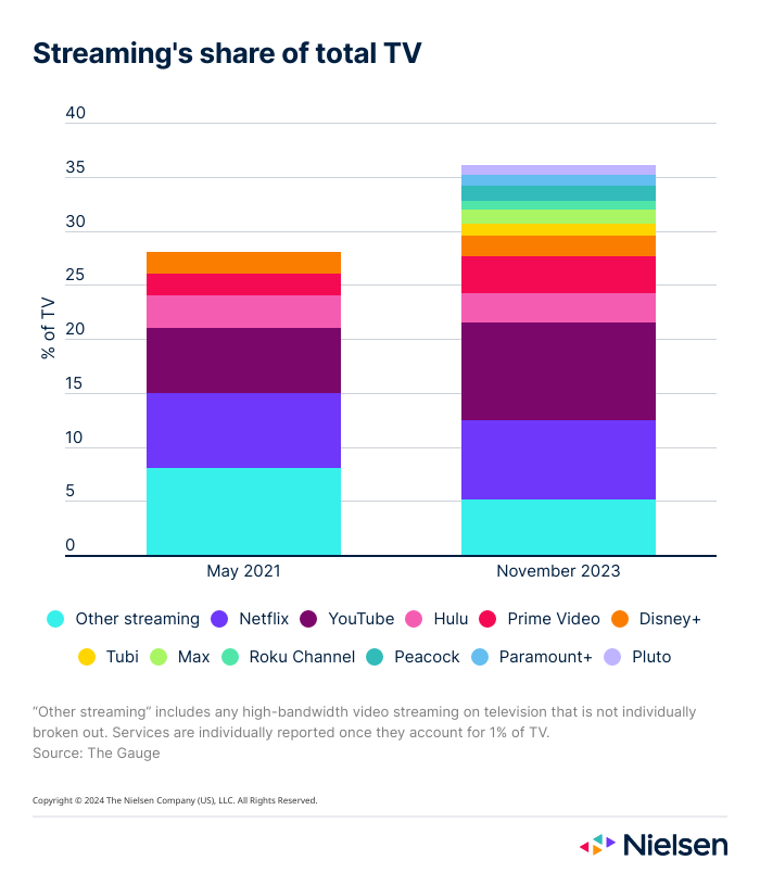 That depth of variety, coupled with the expanding streaming landscape and the on-demand nature of many streaming services, has given streaming the edge with respect to TV usage. When Nielsen launched The Gauge in May 2021, only five streaming services accounted for more than 1% of total TV usage. In November 2023, 11 services were individually reported in The Gauge.