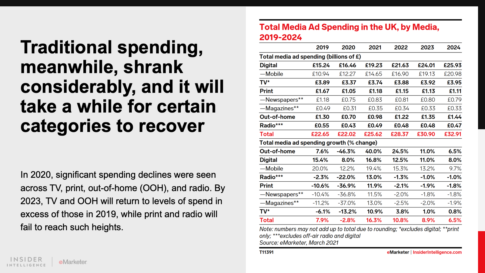 Traditional advertising suffered during the pandemic. Budgets that were destined for these channels were shifted over to digital options, instead. Fueled particularly by massive video gains, digital ad spending will account for more than three-quarters of total media spend in the UK this year.