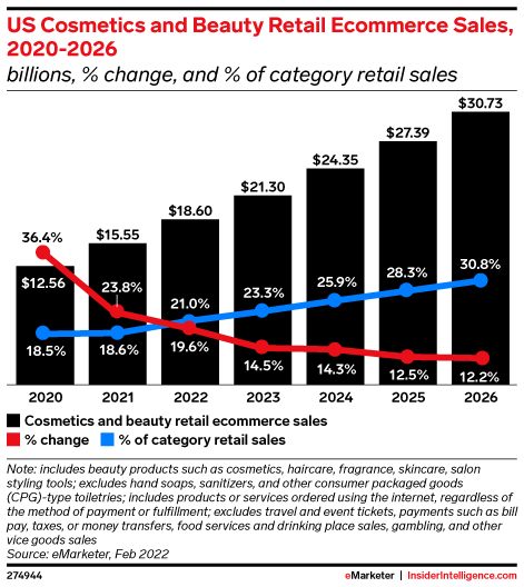 KEY STAT: In 2022, US cosmetics and beauty retail ecommerce sales will be more than double those of 2019 ($18.60 billion versus $9.21 billion). By 2026, those ecommerce sales will account for nearly a third of the category’s total retail sales.