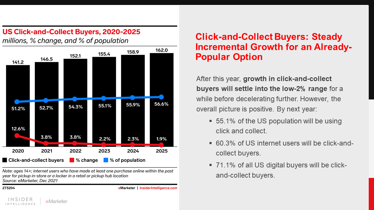KEY STAT: US buyers will spend $95.87 billion via click and collect this year, a 19.4% increase year over year (YoY). However, the fulfillment option’s surprisingly sluggish 2021 means spending is well below what we anticipated.