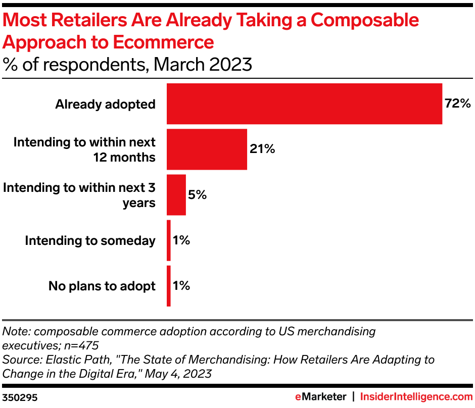 KEY STAT: Composable commerce is going mainstream: A March 2023 survey from Elastic Path found that 72% of US retailers were already using it in at least some manner, and another 21% were planning to adopt it within the next year.