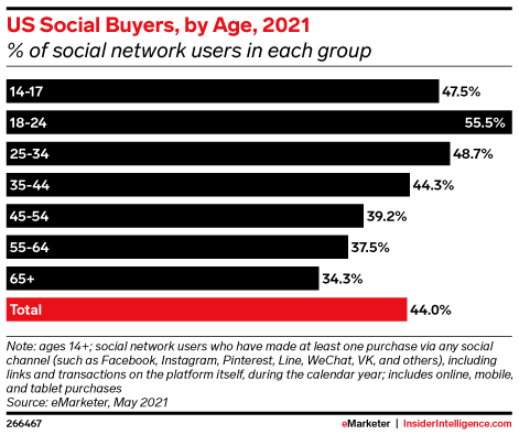 KEY STAT: Gen Z, a digitally native group, is more likely to engage in social commerce than older generations are. More than half of Gen Z adult social network users (ages 18 to 24) are social buyers, and nearly half of Gen Z teen social network users (ages 14 to 17) are.