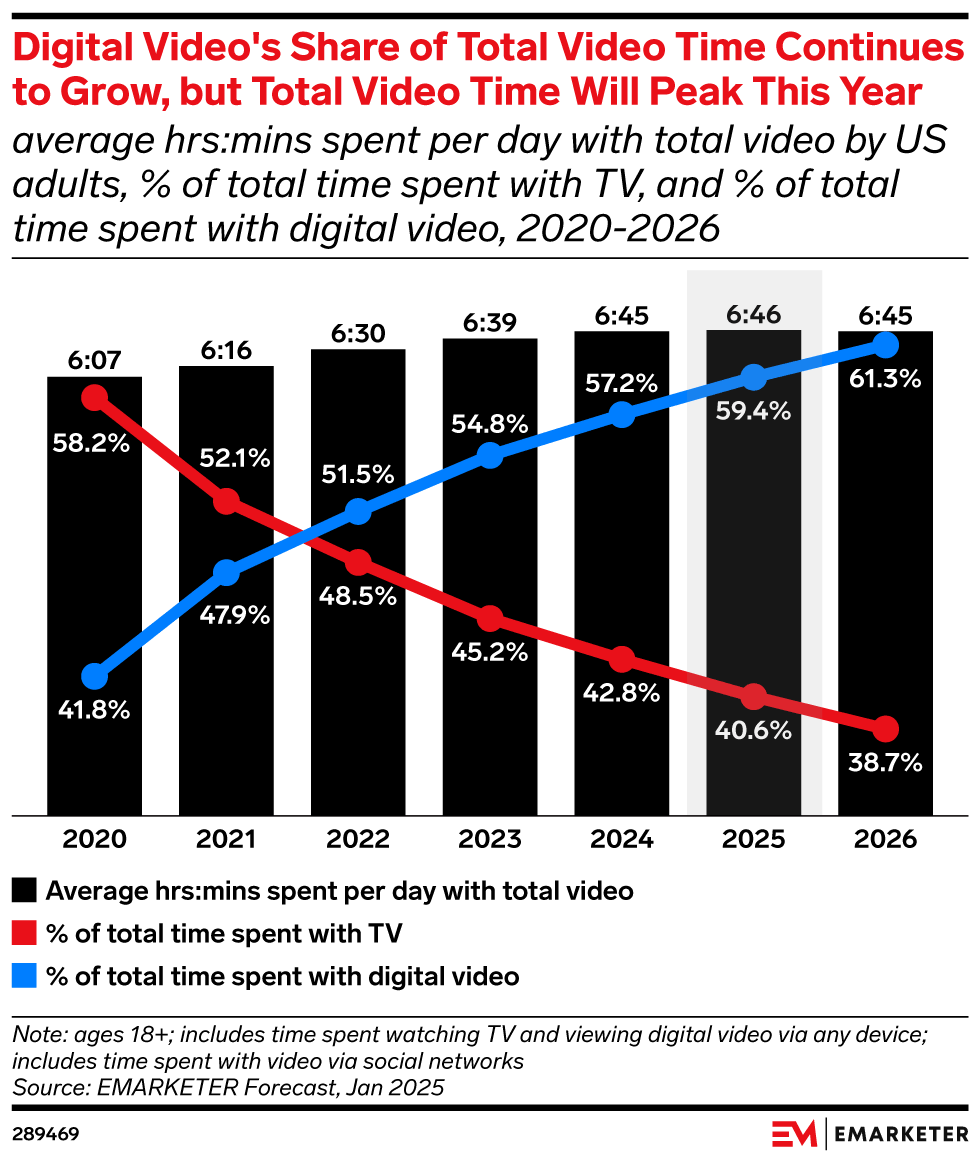 Key Stat: Time spent with digital video will increase by 9 minutes this year, but losses in time spent with traditional TV will almost fully offset that gain. Overall time with video will decline starting next year.