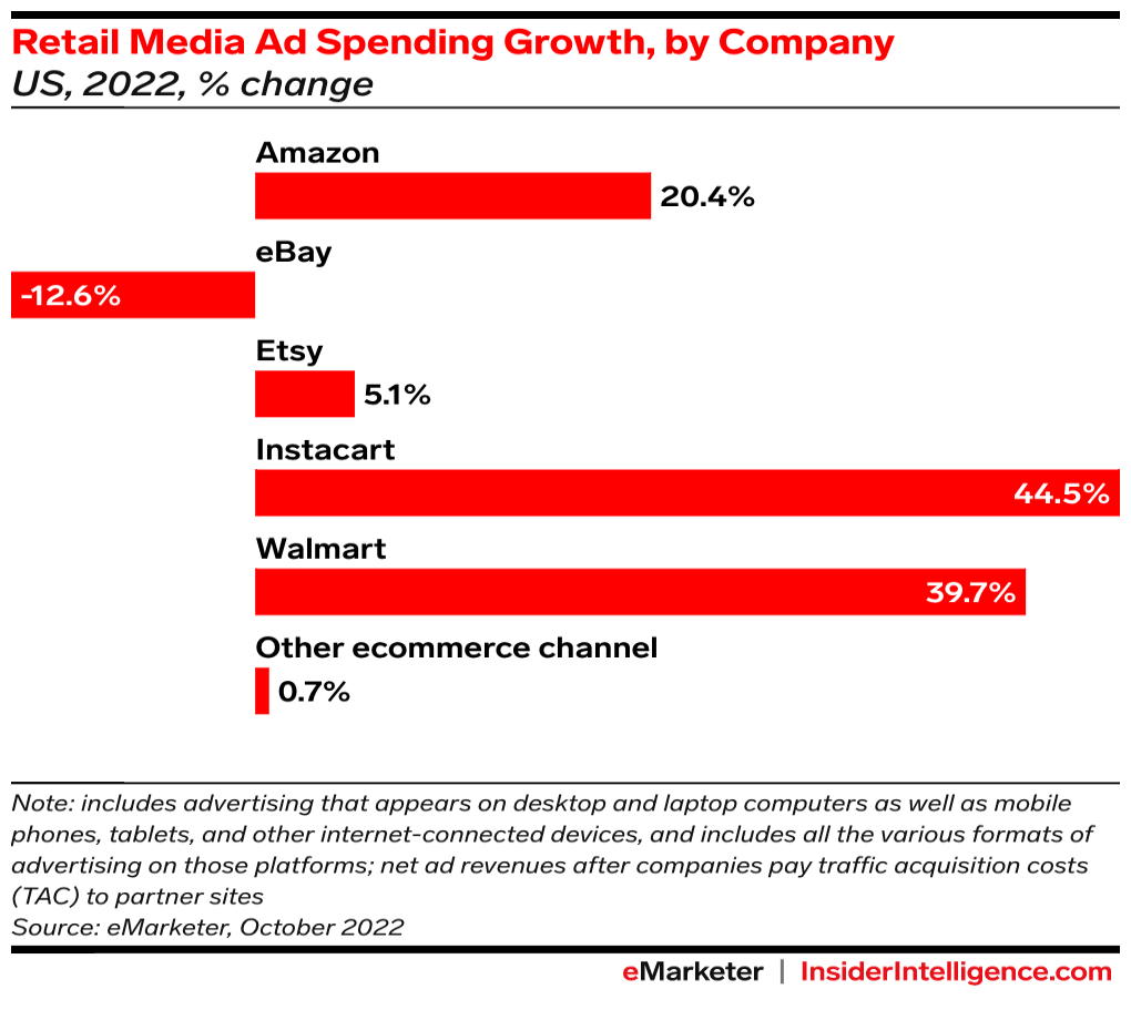 Instacart will experience the largest boost in retail media ad spending this year, growing by 44.5%. Walmart, Amazon, and Etsy will also see positive growth, while eBay’s retail media ad spending will decline 12.6%. To keep that edge, Instacart, Walmart, and Amazon have all made investments in their ad business this year.