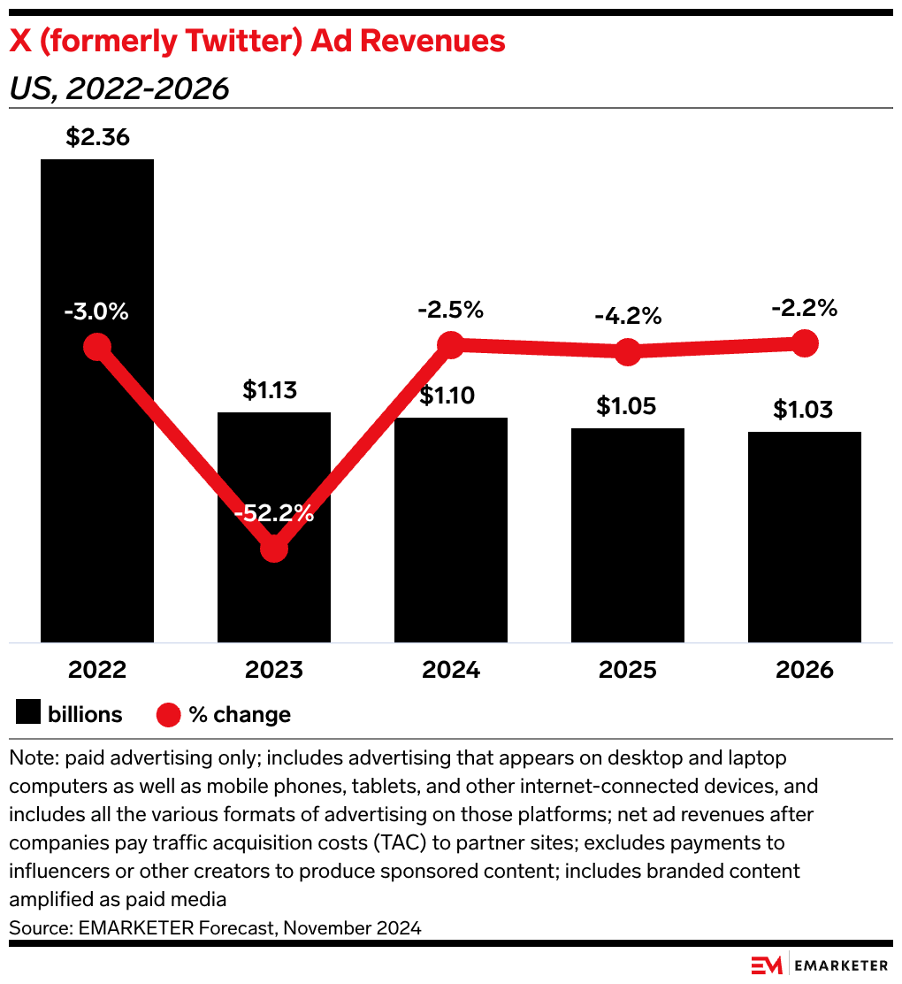 Ad revenues for X are expected to fall 4.2% to $1.05 billion this year, per our forecast, behind second-tier platforms like Snapchat and Pinterest, expected to generate $2.34 billion and $3.11 billion in ad revenues in 2025, respectively—and massively behind Meta platforms, which will generate a combined $73.90 billion in ad revenues in 2025.