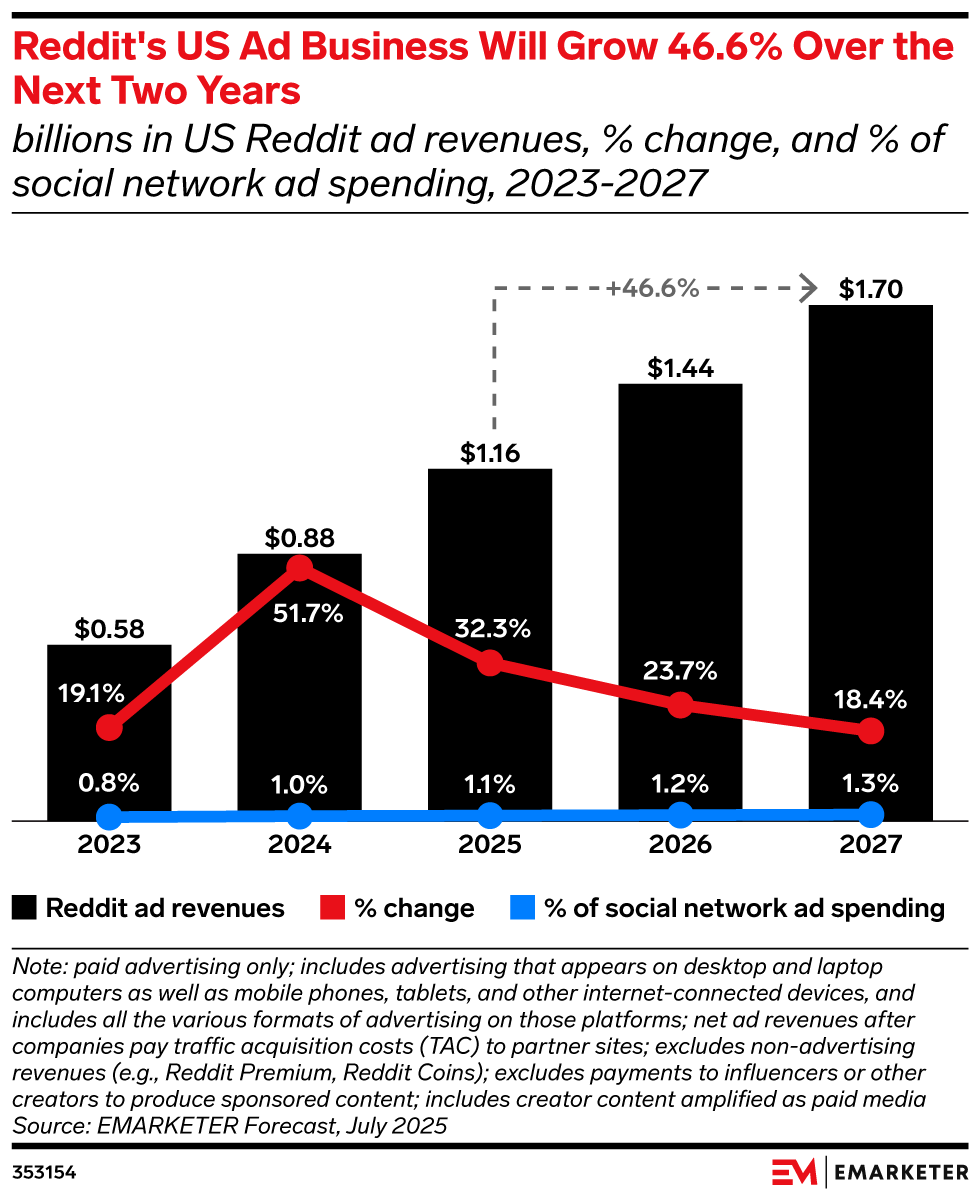 Reddit COO Jen Wong told EMARKETER that the platform has evolved from explaining itself to advertisers to proving it can deliver results. “We’ve shown Reddit can drive real business outcomes,” she said, noting that nine of fifteen verticals grew ad spend by at least 50% YoY. Wong emphasized discovery as Reddit’s next frontier—especially in underexposed sectors like parenting and sports—and said product improvements will make communities easier to find. With ad revenues projected to climb 46.6% in two years, Reddit’s opportunity is one of scale and visibility, driven by authenticity and high-intent engagement.