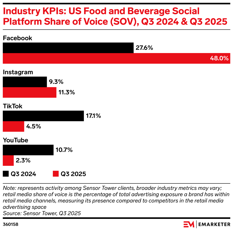 Share of voice reshuffle favors performance as food and beverage brands retreat from TikTok and YouTube, betting on Meta’s scale and attribution edge.